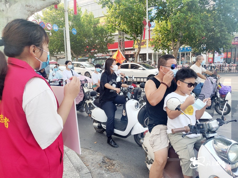 “您好,疫情还未结束,麻烦您把口罩戴好,注意个人防护。”“你好小朋友,外出的时候请佩戴口罩。”这样的提醒声音不断地在各个路口响起,大学生志愿者们手举提示牌,提醒路过的人们佩戴口罩。