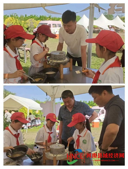 两人一组推磨盘,石磨转动时发出"吱呀吱呀"的韵律,浸泡过的豆子像小珍珠滚落磨眼,乳白的浆液顺着石槽缓缓流下,空气中飘起清甜的豆香。当热豆浆在喉间流淌时,孩子们突然懂了"磨砻流玉乳"的诗意。