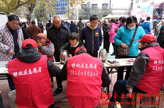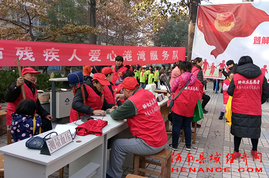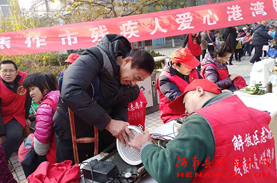解放区残疾人爱心港湾服务队是“全国志愿服务工作先进集体”、曾荣获2010年度“中国好人榜”助人为乐好人、2014年首届中国青年志愿服务项目大赛“阳光助残”类银奖等荣誉,每个月固定两次上街开展便民服务。邓福平:“有这个修鞋的、有配钥匙的、有修小家电的、盲人按摩的、理发的,这个测量血压呀,健康义诊呀,有需要的居民,来到活动现场,我们帮助他来服务。”