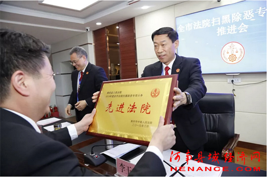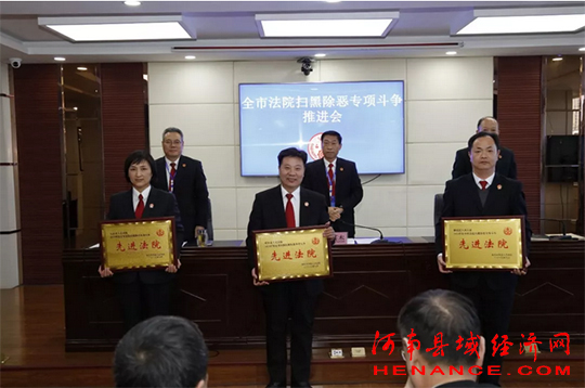 会上,焦作中院院长助理李进忠宣读了《焦作市中级人民法院关于对2018年度全市法院扫黑除恶专项斗争先进集体和先进个人进行表彰的决定》。与会领导为受到表彰的先进集体和先进个人进行颁奖。