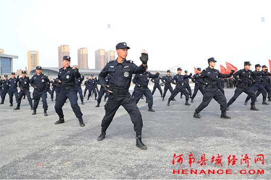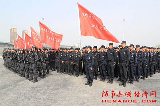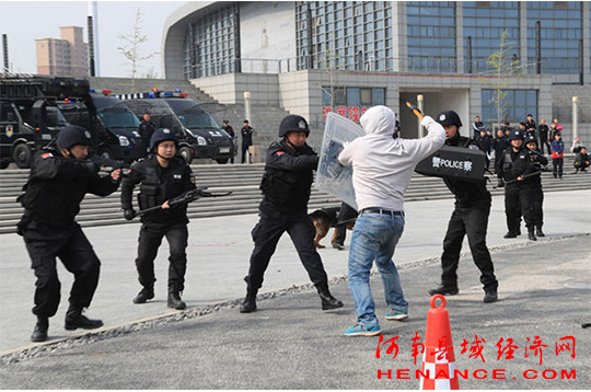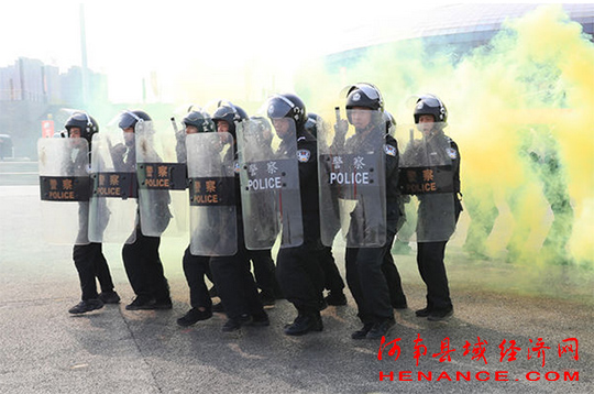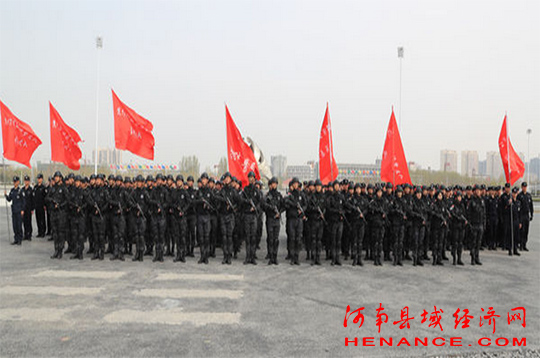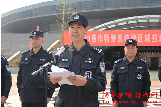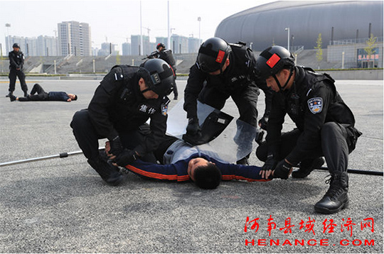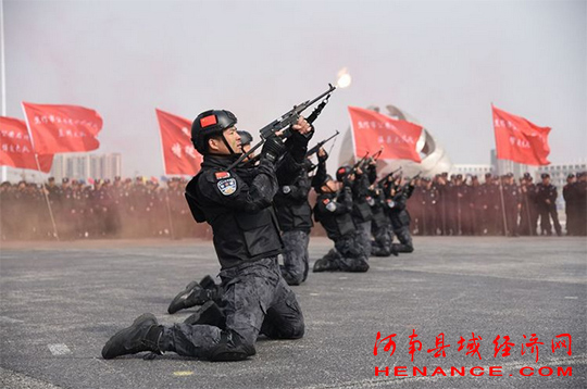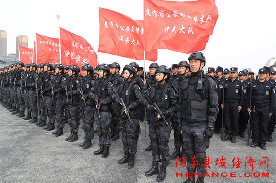河南县域经济网焦作讯:为进一步检验提升焦作市公安特警队伍快反处突能力,推动特警队伍警务实战化建设工作深入开展,2019年3月29日,焦作特警在市太极体育中心广场举行了2019年全市特警系统跨区域拉动暨警务实战模拟演练。焦作特警支队、六县(市)特警大队共九个代表队300余名特警队员参加了此次演练。
