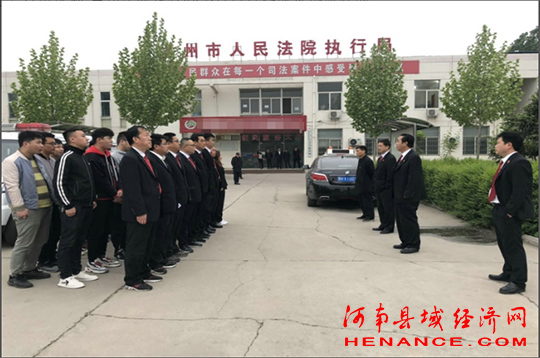 河南县域经济网焦作讯:为积极响应河南省高级人民法院组织的“执行不停歇、献礼建党节”为主题的“执行办案百日竞赛”活动,4月25日凌晨六点,焦作孟州法院执行局办公楼前警灯闪烁,四十余名执行干警已集合完毕,执行办案百日竞赛风暴再掀狂潮,准备对拒不执行法院判决裁定的“老赖”亮剑。本次活动出动警车8辆,部分党组成员、多名市人大代表、政协委员以及孟州电视台媒体记者全程见证、监督。
