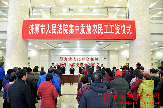 河南县域经济网讯:12月12日下午,在河南济源市人民法院办公楼一楼大厅,128名农民工满怀喜悦地领回了被拖欠的10万多元工资款。