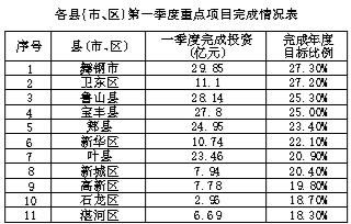 分县(市、区)看,舞钢市、卫东区、鲁山县、宝丰县一季度完成投资情况较好,均完成年度投资目标的25%以上,高新区、石龙区、湛河区一季度完成投资较少,均不足目标的20%。