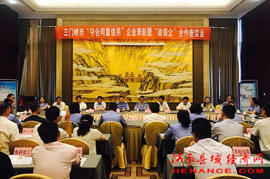 河南县域经济网讯:5月18日下午,三门峡市召开守合同重信用企业表彰暨“政银企”合作座谈会,三门峡市工商局党组书记、局长赵冶钧,工商银行三门峡分行、建设银行三门峡分行、中国银行三门峡分行、农业银行三门峡分行、邮储银行三门峡分行、中保财险三门峡市分公司,以及各县(市、区)工商质监局、市工商局直属各分局主管局长、监管股长,三门峡市2016年度河南省“守合同重信用”企业负责人参加了会议。