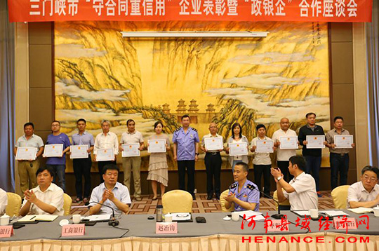 座谈会上,宣读了《河南省工商行政管理局关于公示2016年度“守合同重信用”企业的公告》,对三门峡市获得2016年度省级“守合同重信用”的51家企业进行了表彰,赵冶钧局长为“守合同重信用”企业颁发公示证书;“守合同重信用”企业三门峡市三味奇食品有限公司做了代表发言;工、建、中、农、邮储等五家银行和人保财险公司分别介绍了各自优势及支持帮扶政策。