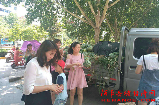 方里村是区教体局扶贫帮扶村,6月份以来,方里村的西瓜丰产上市,但瓜农喜忧参半又遇卖瓜难题。这件事源于6月6日区教体局扶贫帮扶人员刘红英发出的一条微信:李村特色有机西瓜,欢迎大家用“吃”来帮助方里贫困瓜农!为了方便大家购买,刘红英与瓜农卫明军联系下午5点将瓜送到教体局楼前。消息在朋友圈发布后,当天下午,局机关人员和推着自行车、骑着电动车、专程开车过来的“吃瓜群众”,纷纷赶到教体局楼下买瓜。仅2个多小时,卫明军的一车3000斤多斤西瓜已全部卖完。为帮助瓜农实现产销两旺、增收脱贫,教体局党委号召局机关全体党员干部带头购买西瓜,大家自发制作美篇等图文信息利用朋友圈、好友群作宣传,吸引同事、亲戚、朋友和更多市民前来购买西瓜,用实际行动助推脱贫攻坚。