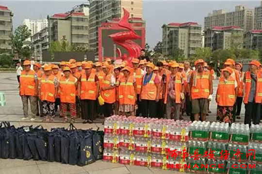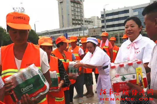 商丘市中心医院南丁格尔志愿护理服务队现场为60名环卫工人代表送去了水杯、矿泉水、毛巾、香皂、牙膏、白糖、去痱止痒花露水等慰问品,让他们在炎炎夏日感受丝丝清凉。