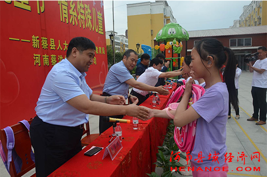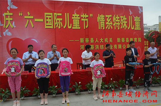 河南县域经济网驻马店讯:( 刘文喜 通讯员 李猛)5月28日上午,在第69个六一国际儿童节即将来临之际,新蔡县人大常委会主任陈学功带领县人大常委会教工委相关人员来到县特殊教育学校,为孩子们送去了儿童节礼物和诚挚的问候。县教育局局长陈曦、蔡洪坊酒业董事长李华伟等参加慰问活动。